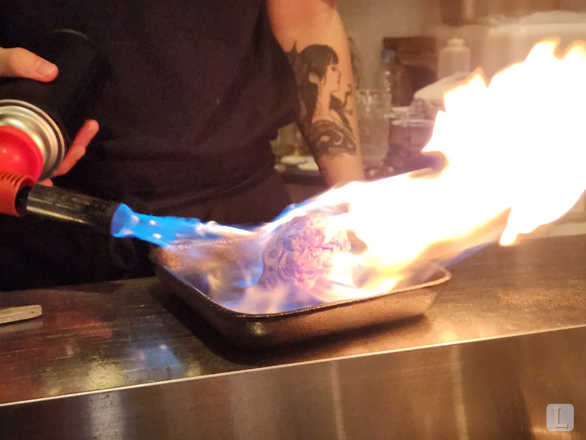 고기가 나오기 전에 먼저 트러플 한우 육회를 주시는데, 토치로 겉을 구워 주세요.
